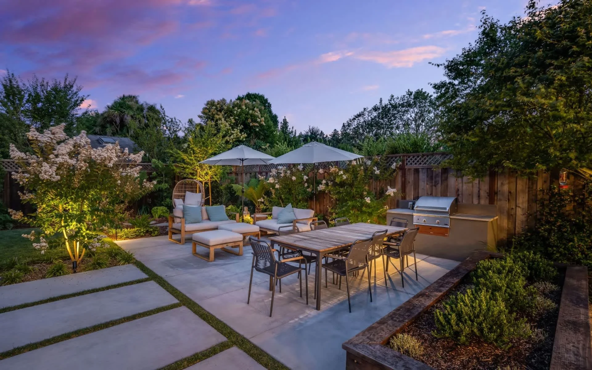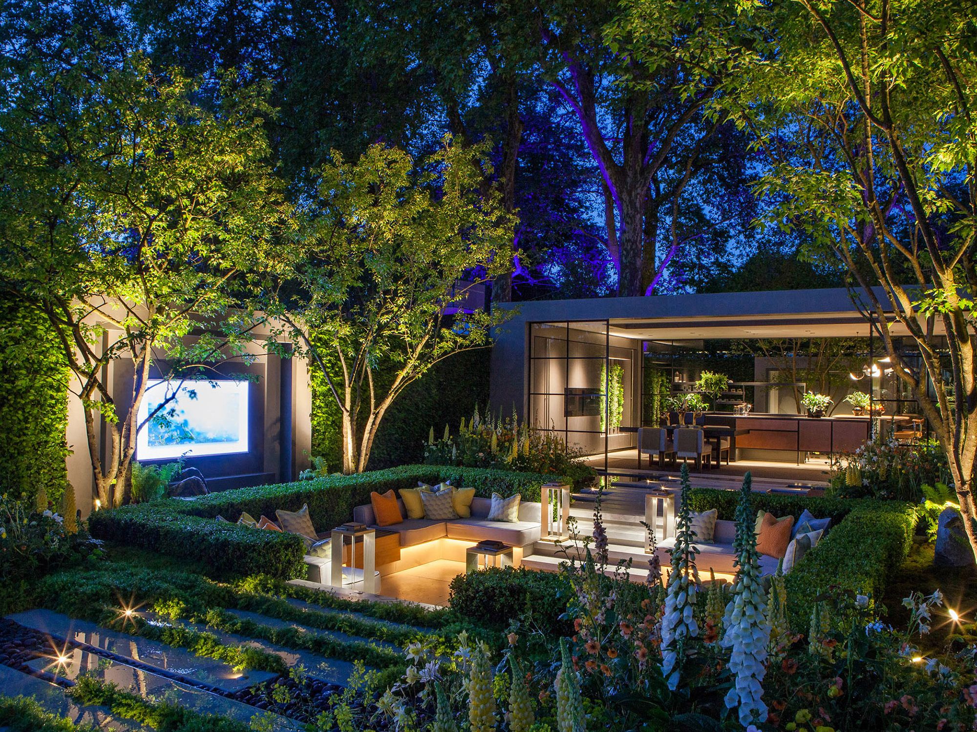 This model treats the backyard as a visual extension of the living room. To prevent the windows from becoming “black mirrors” at night, the light levels in the backyard must be balanced with the interior lighting.
